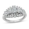 This mesmerizing diamond ring collection features five distinctively-shaped diamonds, symbolic of everything she means to you. Each diamond shape has a different meaning, from integrity and wisdom, to confidence, totality, and elegance. This stunning 10K white gold ring features a pear-shaped, princess-cut, emerald-cut, round-cut and oval-cut diamond set across the center. Sparkling baguette-cut diamonds flank outward above and below, with two brilliant round-cut diamonds finishing the iconic look. The ring has a total diamond weight of 2 carats.