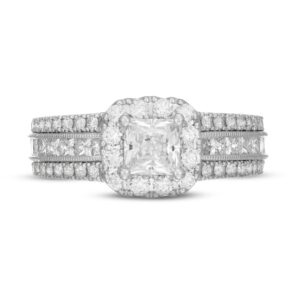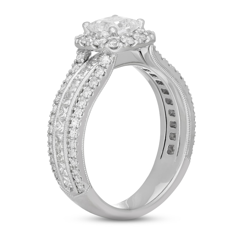 This resplendent engagement ring showcases a glamorous 3/4-carat princess-cut diamond framed in brilliant round diamonds. Three rows of round diamonds shimmer down the band, complemented by classic milgrain accents for a sophisticated look. The ring is styled in iconic 14K white gold and has a total diamond weight of 2 1/8 carats.